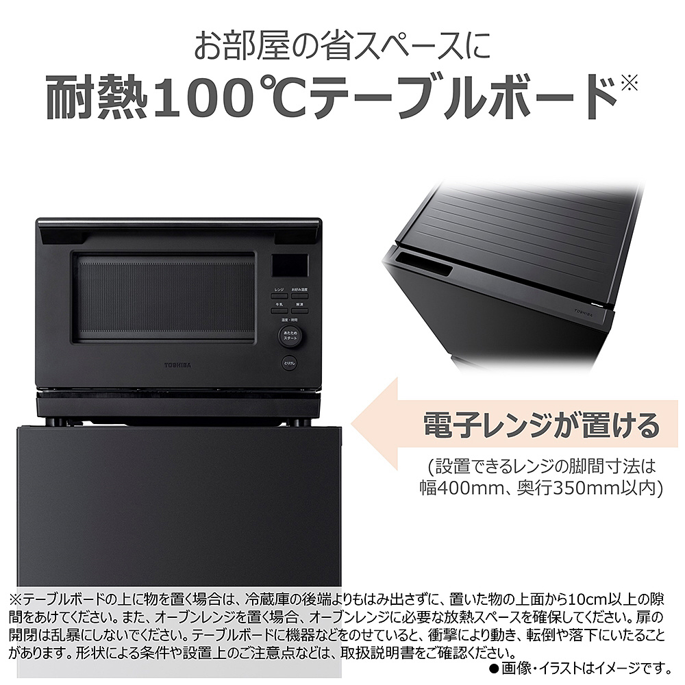 冷蔵庫の上部に耐熱ボードを採用し、レンジの配置も可能。