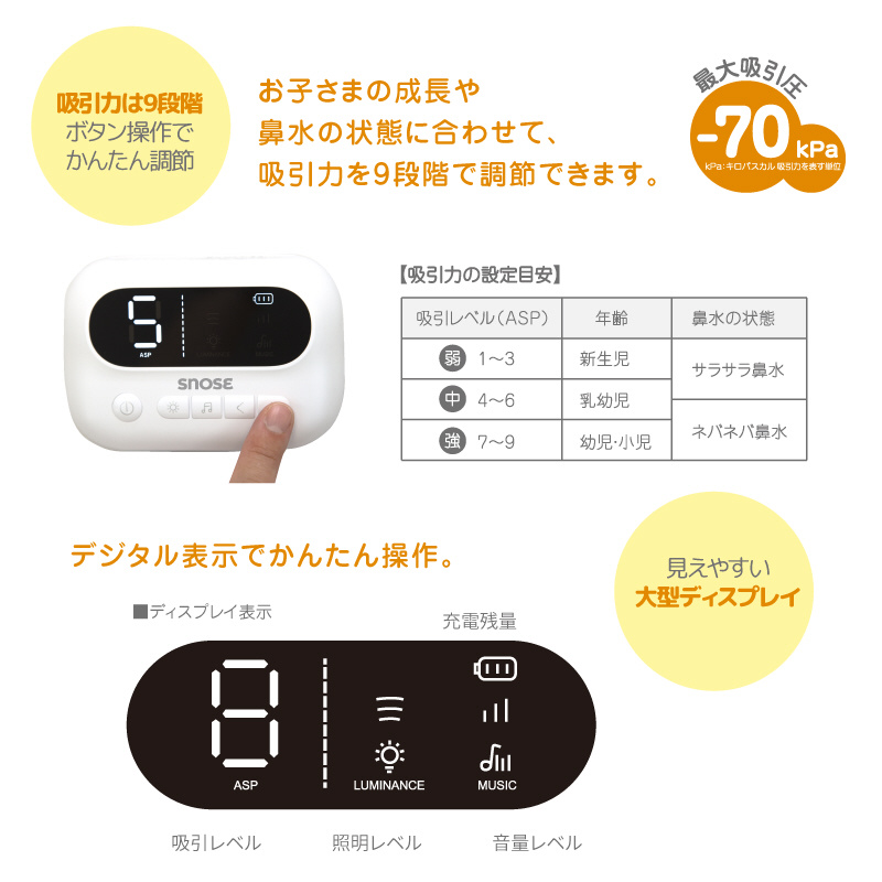 お子さまの成長や鼻水の状態に合わせて吸引力を9段階で調節できます。