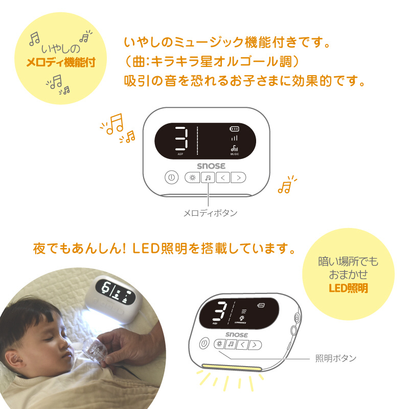 ミュージック機能(曲:キラキラ星オルゴール調) 吸引の音を恐れるお子さまに効果的です。