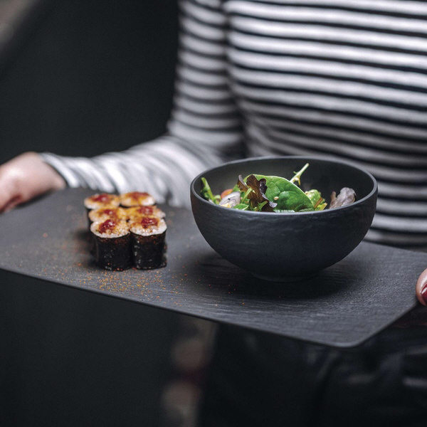 スレートのような見た目がクールな一皿。洋食器は丸くなくてはならないという概念を覆した一枚!「ロック」はあらゆる角度から型破りなアイディアを実現しています。長方形でフラットな一枚は、オードブルやおつまみ、焼き魚などのメインディッシュ、デザートまで、料理を引き立ておいしそうに見せてくれる優れものです。贈り物としても人気です。