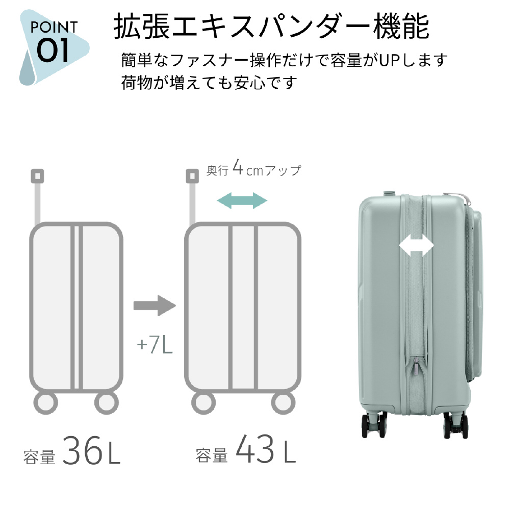 スピナー54は、1〜3泊程度の旅行に最適な機内持ち込み対応サイズ。新幹線・電車等で移動する国内旅行や修学旅行、短期の出張におすすめです。フロントポケットにはPC、タブレットなどの収納スペースがありビジネスシーンでも活躍します。