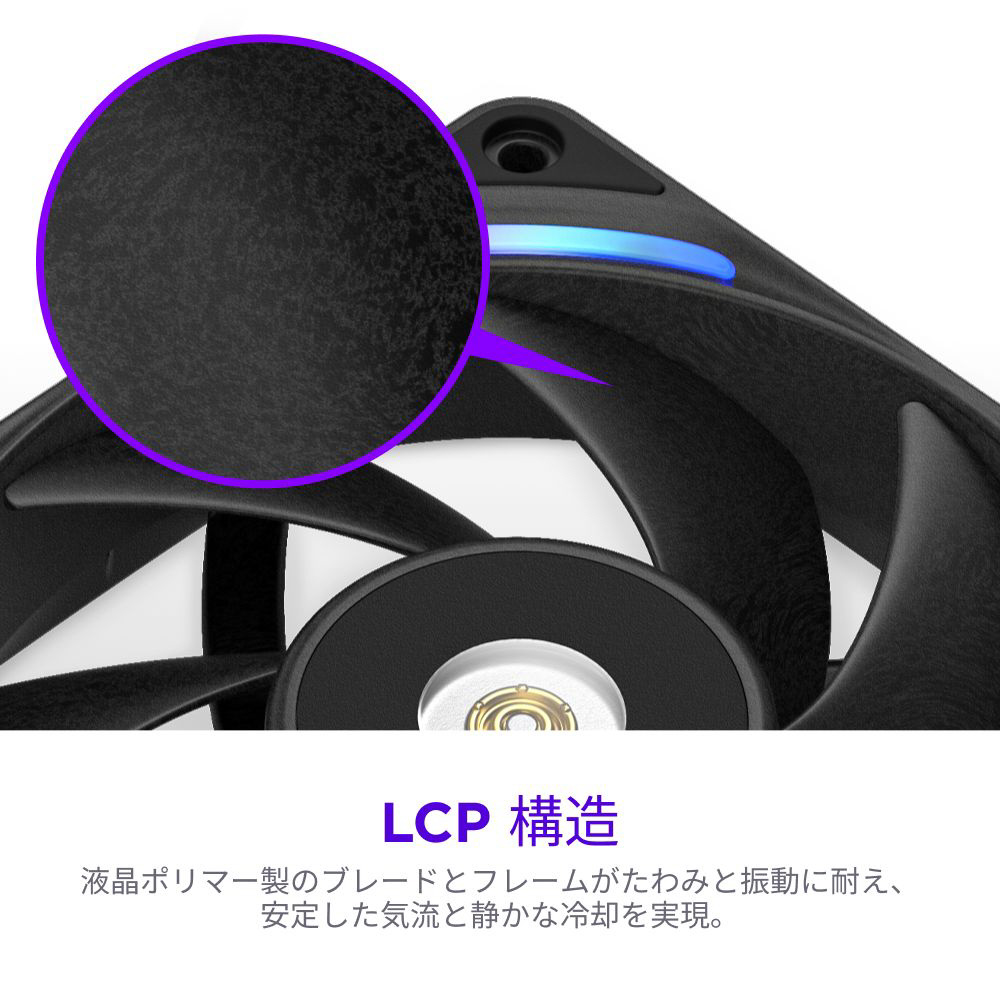 LCP構造、最適化されたブレード、ハイブリッドベアリングシステムにより、強力で静かな冷却性能を実現。