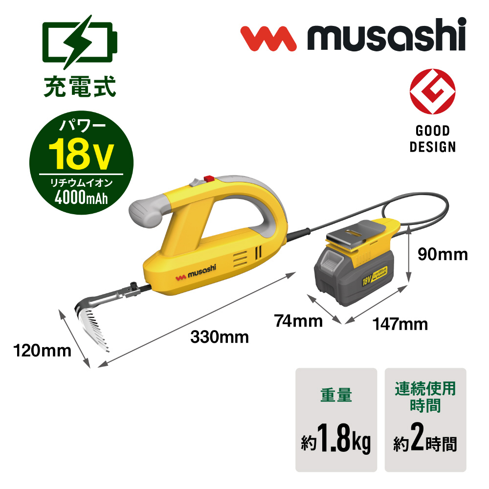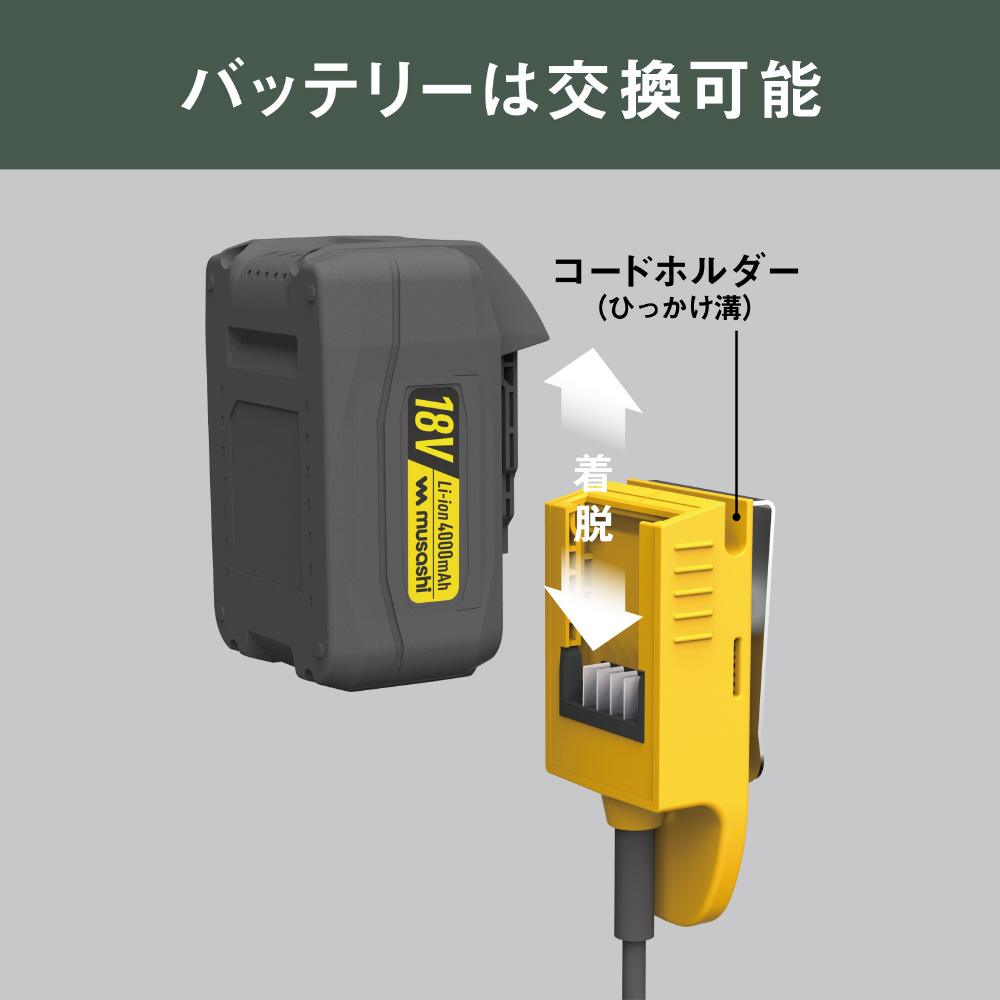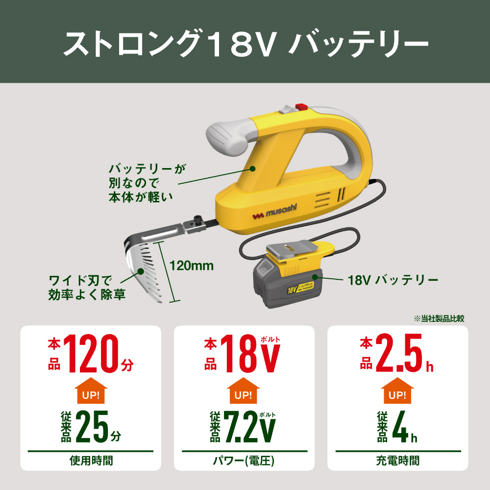 ワイド刃で除草力UP ストロング18Vバッテリー搭載