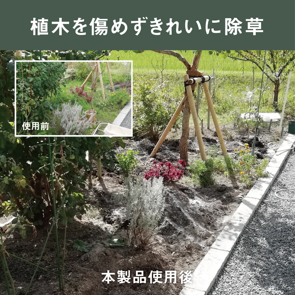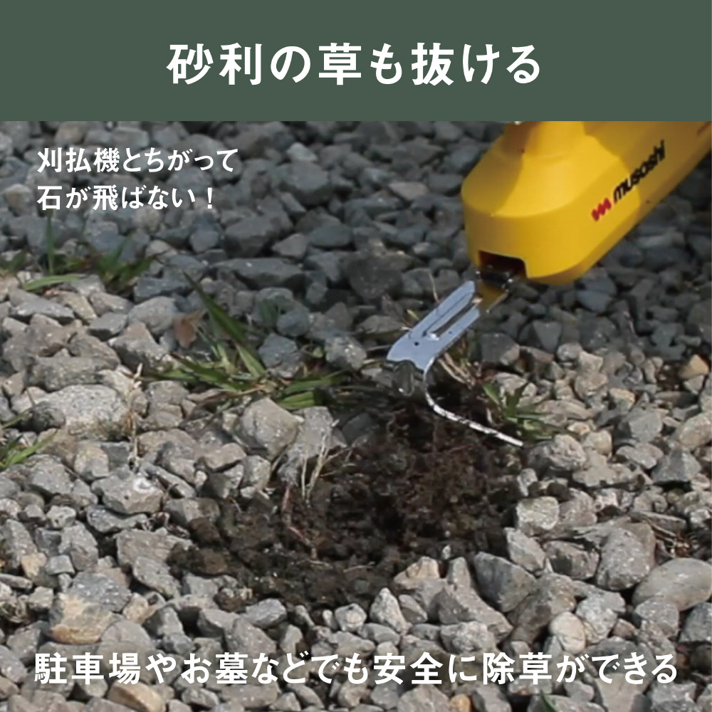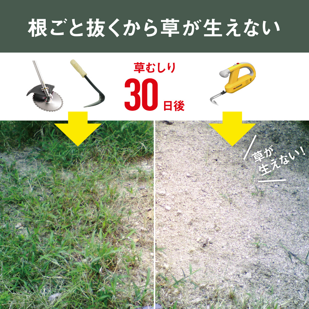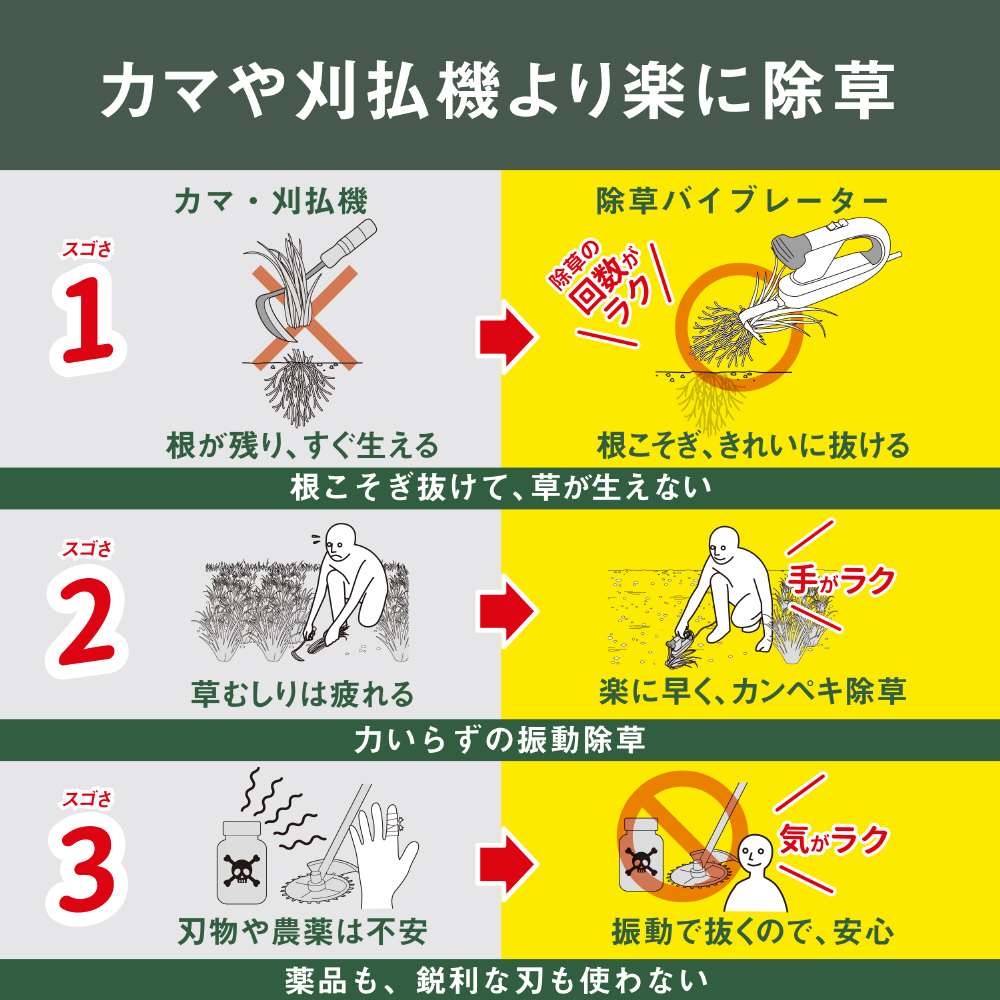 除草バイブレーターは、力いらずの振動除草。振動によって根こそぎキレイに抜けるのが特長です。