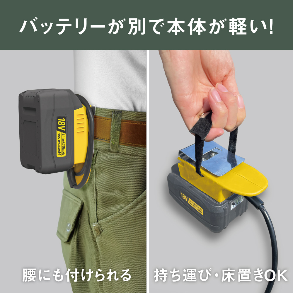 パワフルなACタイプと利便性の高い充電タイプの両方の特長を兼ね備えています。バッテリーは腰に装着できるので重量やコードの取り回しを気にすることなく作業可能です。