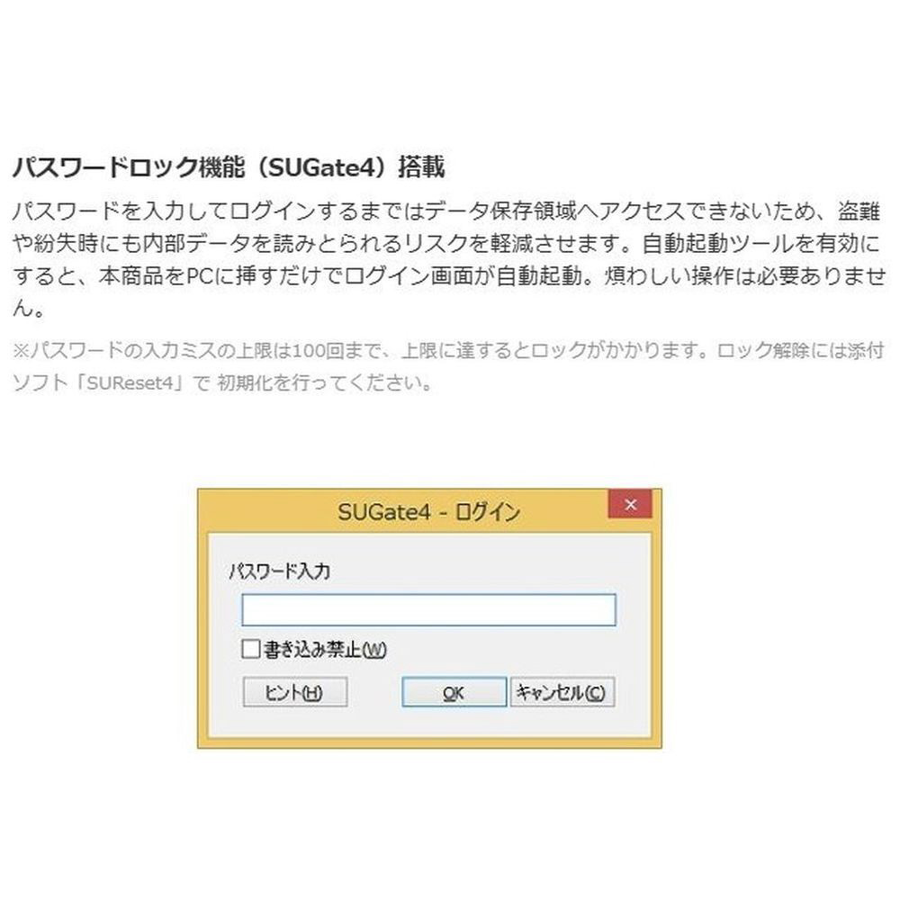 簡単操作で強固なパスワードロック「SUGate4」とAES256bitによる自動暗号化機能を搭載したセキュリティUSBメモリーです。データ保存の全領域を強制的にパスワードで保護し、フラッシュメモリーを直接解析された場合でも自動暗号化機能でデータを保護します。※ 本商品にはプログラム領域が存在し、ユーザー領域(利用できる容量)が若干減少します。