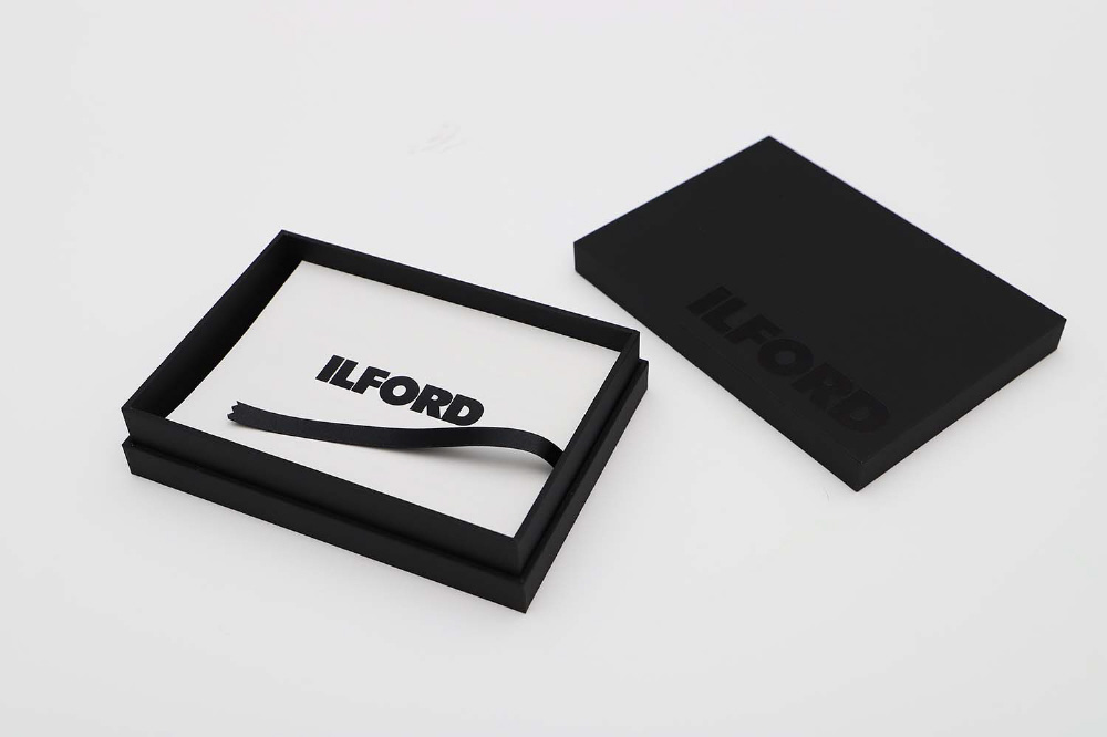 フォトカードボックスは、しっとりした手になじみやすいマット調の仕上げで、黒のILFORDロゴが入った高級感漂う仕様となっています。